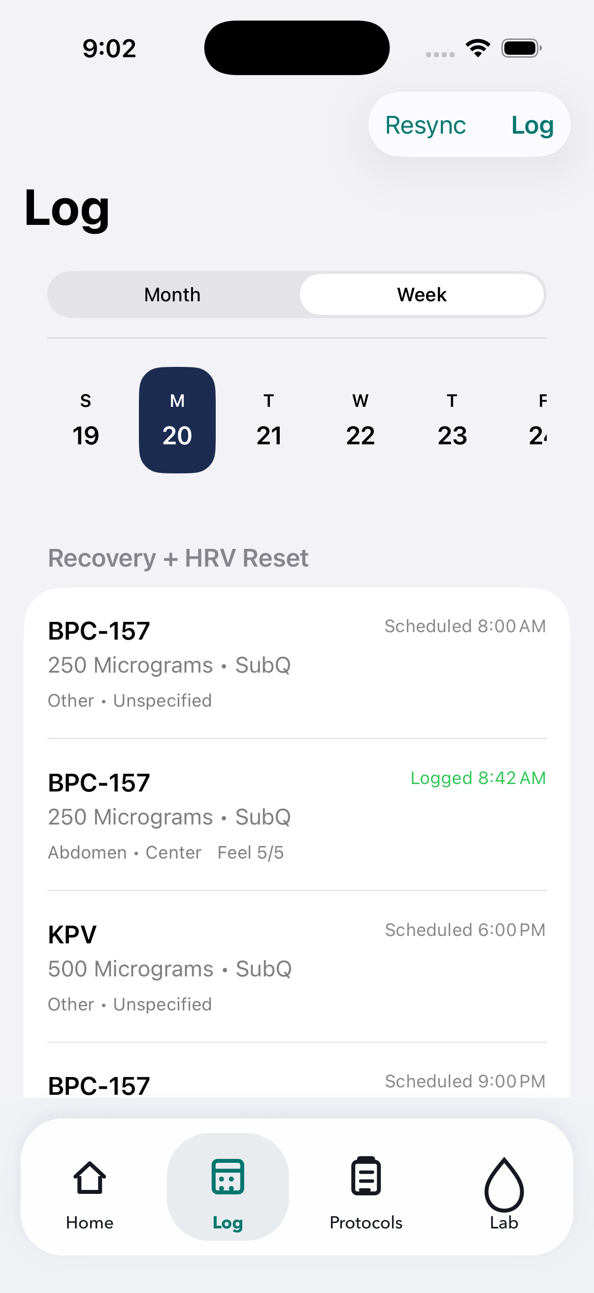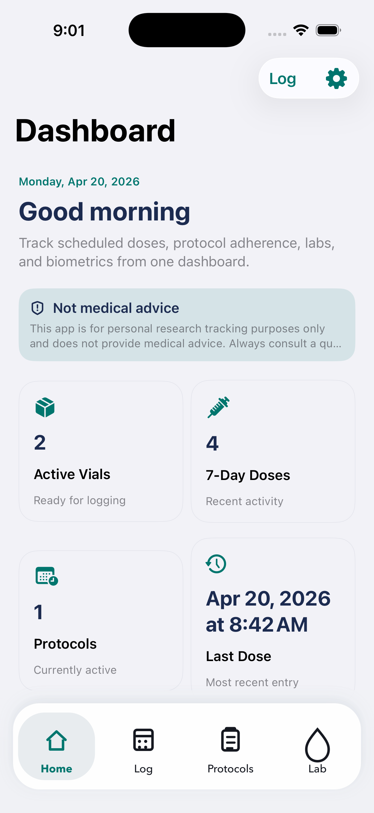 Record dose timing, route, site, notes, and vial changes from a focused daily flow.